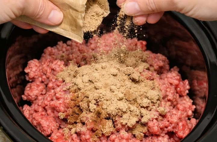 Place raw ground beef in the bottom of a 5–6 quart slow cooker. Break into large chunks (no browning needed).