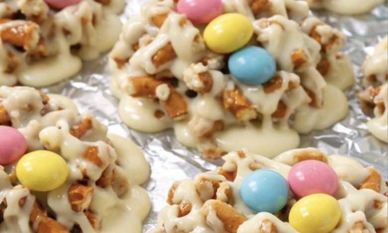 Step 5: The Festive Topping: Line an 8×8-inch baking pan with parchment paper. Pour the warm candy mixture into the pan, spreading it out evenly with a spatula. Sprinkle the candy-coated chocolate eggs (and any optional sprinkles) across the top, pressing them down lightly so they stick to the surface.