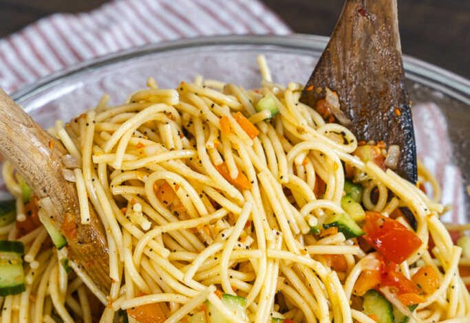 Tender spaghetti is cooked, cooled, and ready to soak up a zesty Italian dressing. Instead of a heavy sauce, the pasta is tossed with light, tangy flavors, while pasta & salad seasoning adds that classic deli-style depth people love.
