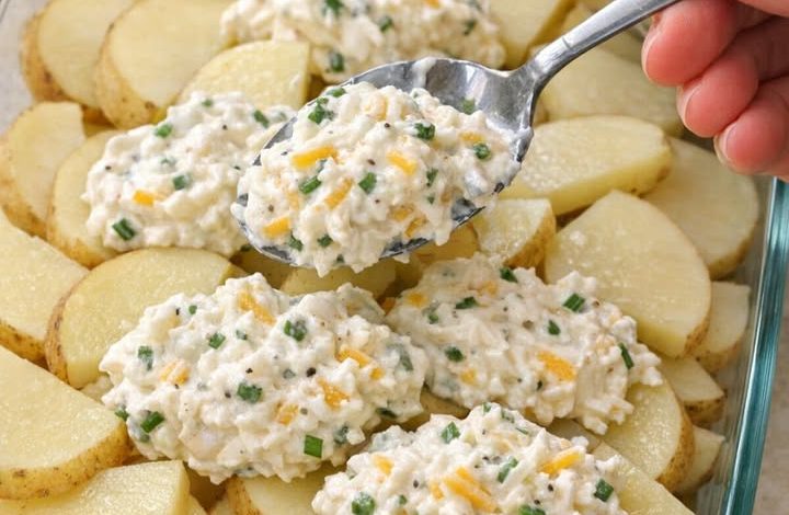 Tip: If the mixture feels too thick to spread, whisk in a splash of milk or cream. You want it to be “dollop-able” so it can sink between the potato layers.