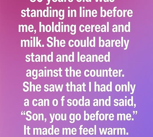 An elderly woman, close to eighty, stood in line ahead of me, clutching a box of cereal and a carton of milk. She leaned against the counter for support, her frailty obvious. When she noticed I carried only a single can of soda, she smiled and said, “Son, you go before me.”