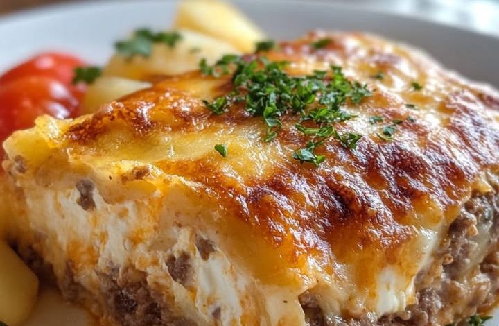 This hearty Amish Breakfast Casserole is a comforting, oven-baked dish layered with savory ground beef, hashbrowns, and cottage cheese, bound together with eggs and topped with melted cheddar.