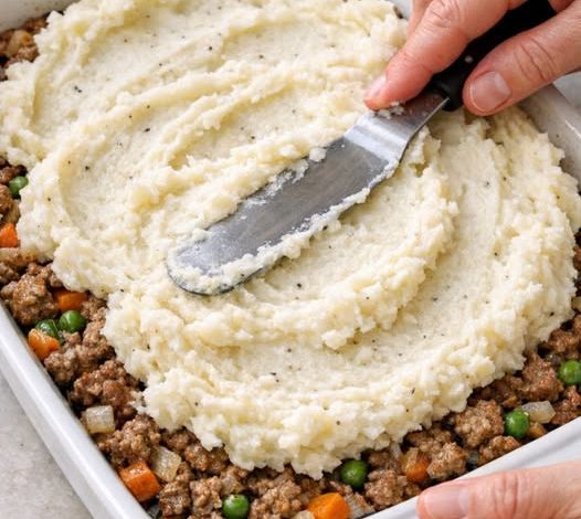 - Assemble: Spread beef mixture in baking dish. Top with mashed potatoes, smoothing or creating ridges.