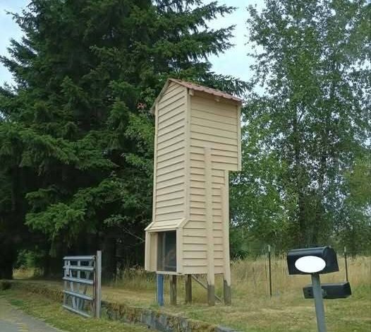 Is it “A watchtower?” Or perhaps “A weather instrument?” Maybe it is just “A deer feeder?” or even “A giant birdhouse for birds large enough to terrify you?”