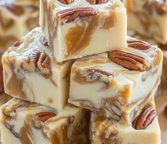 This rich, creamy fudge is made with white chocolate and sweetened condensed milk, swirled with smooth caramel sauce and studded with chopped pecans.